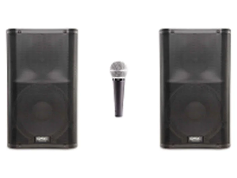 Up to 200 people (2) QSC K12 1000 Watt 12″ Powered PA Speaker (2) adjustable Poles (1) Wire...