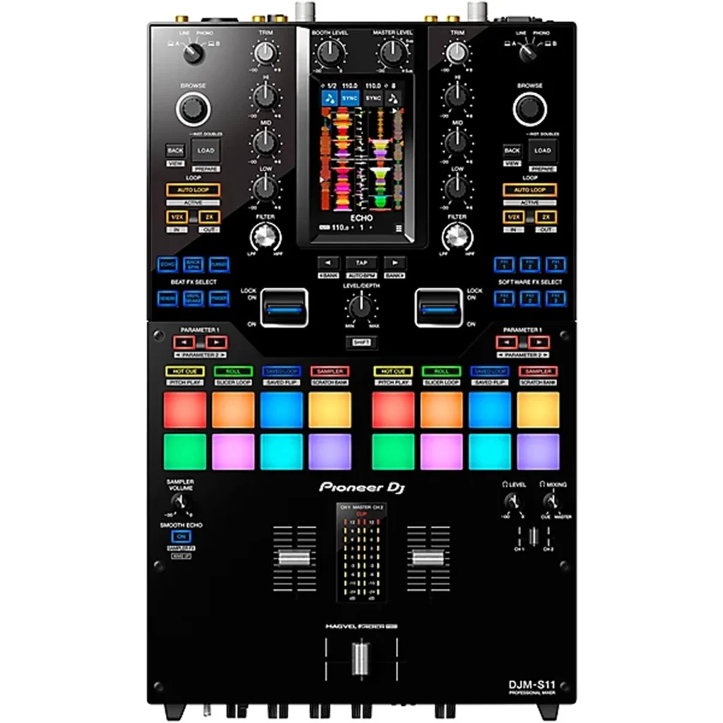 The Pioneer DJM-S11 2-Channel Battle Mixer is a professional DJ mixer built for live performances and club environments. With responsive performance pads, advanced effects, and a customizable touchscreen, it delivers precise control and seamless mixing with Serato DJ Pro and rekordbox compatibility.